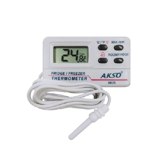 Termômetro Freezer e Geladeira AK25 conta com sensores interno e externo, além de alarme sonoro de temperatura alta e baixa para a sonda externa. Possui base magnética, que permite a fixação em superfícies metálicas, facilitando as medições. Sua faixa de medição vai de -10 a 50°C (sensor interno) e -50 a 70°C (sonda externa).
